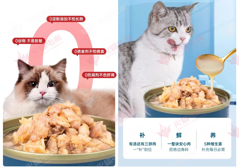 團(tuán)隊(duì)結(jié)合市場(chǎng),錨定品牌方初期的核心目標(biāo)受眾為90后年輕新養(yǎng)寵人群。在視覺上,不過度追求精美的效果圖,走差異化路線,以更落地的方式呈現(xiàn)每一款產(chǎn)品。用「勺子」「汁水」以及貓咪「舔舌」的本能反應(yīng)等一系列元素,將天然、新鮮的品牌印象直觀地傳達(dá)給消費(fèi)者;在產(chǎn)品上,以「0防腐劑」「0淀粉」展現(xiàn)天然原材,以添加「牛磺酸」「葉酸」「益生元」凸顯營養(yǎng)豐富,以「專家團(tuán)隊(duì)」「資質(zhì)認(rèn)證」作為信任背書。如此通過產(chǎn)品+視覺雙驅(qū)動(dòng),來鞏固「懂貓愛貓」的輕奢貓品牌的形象定位,滿足寵物主精細(xì)化喂養(yǎng)需求。在雙方配合下,截至發(fā)稿日,該寵物品牌天貓旗艦店粉絲已突破24萬。